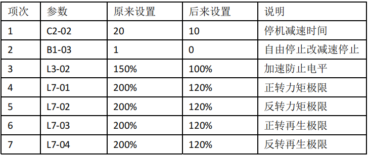 e.變頻器參數設置,停止方式由”自由運行”改為”減速停止”,減速時間 10 秒。